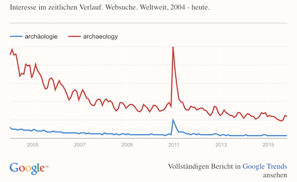 Anbei das Internetverhalten, wie oft das Thema "Archäologie" geklickt wurde (Deutsch- und englischsprachiger Raum). Ich denke und hoffe, dass das Tal durchschritten ist. Aber bis jetzt war die Tendenz eindeutig...