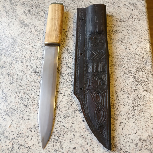 Griff aus einer alten Eichenbole mit Hornstücken von altdeutschen Kühen verziert. Die Lederscheide mit klassisch gegärbter Methode hergestellt. Diverse Bronzenägel und Nieten veredeln das Stück.