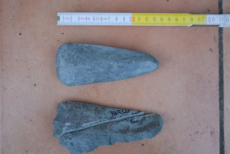 Pfeilspitzen aus Jadeit(it) sind mir ebenfalls nicht bekannt. Das Picken eines Objektes von der Größe einer Pfeilspitze dürfte nicht leicht sein, vom Schleifen ganz zu schweigen - die Haut an meinen Fingerspitzen ist in den letzten Tagen recht dünn geworden, man rutscht bei kleineren Objekten doch eher mal ab. Schon das Beil dieser Größe ist erheblich schwieriger zu schleifen als das große Flintbeil.
