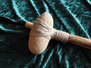 - Hammerkopf aus gefundenem oder erworbenem Stein: Der Stein soll von Menschenhand möglichst unbearbeitet sein (z.B. Flusskiesel oder Kiesel aus dem Betonwerk); gerade so, wie er sich in der Natur finden lässt. Der Grund für diese Entscheidung besteht in meiner Annahme, dass sich auch mit gänzlich unbearbeiteten Hammerköpfen (d.H. z.B. nicht durch Anarbeiten einer Spitze oder Schneide verbesserten Hammerköpfen) recht gut steinmetztechnisch und auch bildhauerisch arbeiten lässt - wie ja auch bereits bekannt ist (z.B. altes Ägypten, siehe Quelle [1]).