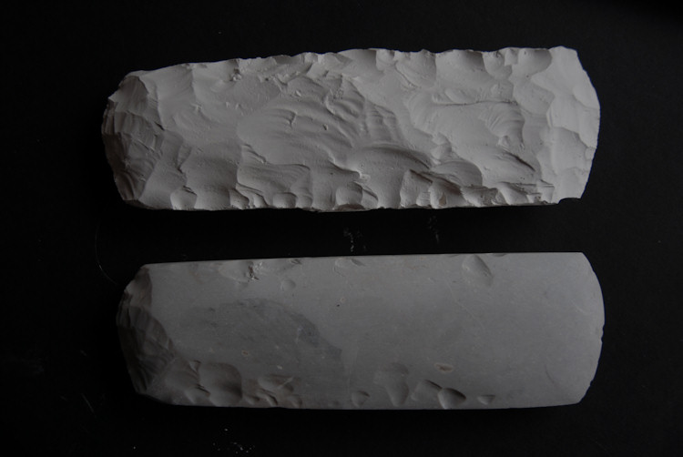 Bei einem ersten Vorversuch mit einem anderen Blattspitzenbeil (hier mal ein Eindruck, oben ein Abguss vom Rohling, unten das fast fertig geschliffene Beil, auch ein dünnnackiges, aber schmaler + dünner) benötigte ich 9 Stunden, allerdings muss die eine Seite noch fertig geschliffen und die Schneide noch geschärft werden. Hier habe ich allerdings keine Daten genommen bis auf ganz grob die Arbeitszeit.