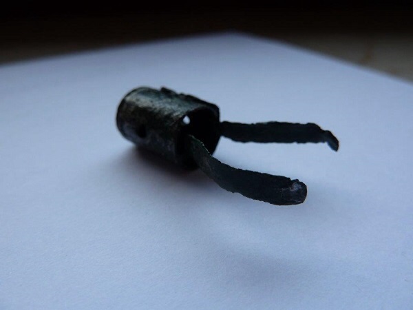 Kürzlich ist in einem bayerischen FMA-Damengrab im lateralen Beckenbreich (wohl Tasche) ein Buntmetall-Teil rausgekommen, das uns noch Rätsel aufgibt. Länge total 31mm, Durchmesser der Hülse ca. 8 mm, L u. R. gelocht. Der anfängliche Verdacht einer "Bergkristallfassung" lässt sich wohl nicht halten, weil nur zwei Klammern da sind und diese unten offen sind ( nicht fragmentiert).