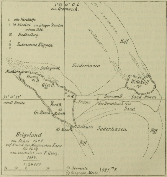 Franz Geerz, Historische Karte von Helgoland, Schleswig 1884. Aus : Olshausen, Otto : Zur Vorgeschichte Helgolands, Berlin 1893, S. 502, Fig. 1. In public domain.