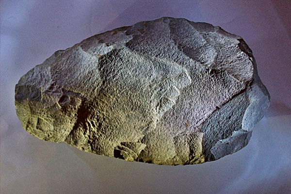 Vor geraumer Zeit zeigte mir ein Sammler ein Fundstück, das mich hell auf begeisterte. Zumal ich direkt davor einen anderen Sammler traurig machen musst, da sein vermeintlicher „Schatz“ nur ein Cynolith war. Bei dem anderen Fundstück handelte es sich um einen Faustkeil aus (wohl) Sandstein von grau grüner Farbe mit schmutzig weißen Partien. Das Gewicht liegt bei 1602g, die Länge bei 21cm, Breite 12,5 und eine maximale Höhe von 8,2cm. Das Problem ist bei diesem Fundstück der Fundort. Er wurde von dem Sammler ein einem von ihm erworbenen Wohnwagen gefunden. Der Wagen diente jahrelang als Ferienwohnung im Landkreis Lüchow-Dannenberg. Ob der Faustkeil nun auch aus dem Kreis stammt oder nicht, ist die Frage. Ich glaube, dass ich das Material schon einmal gesehen habe. Aber in Massen dürfte es hier nicht vorkommen. Vor allem, dürfte man hier den Feuerstein bevorzugt haben.
