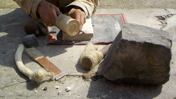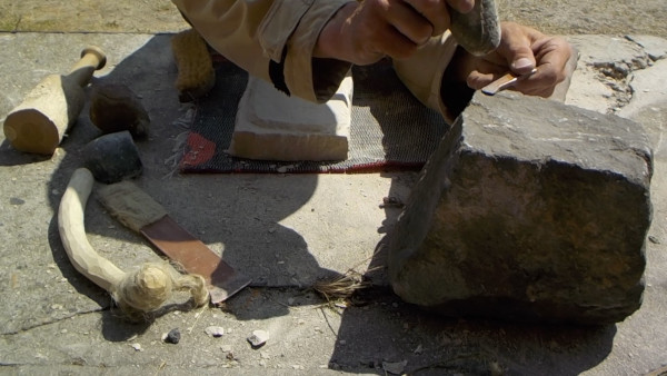Vor einer Nachahmung der in dieser Dokumentation gezeigten handwerklichen Arbeitstechniken wird AUSDRÜCKLICH GEWARNT! Die in dieser Fotodokumentation gezeigten handwerklichen Techniken der Werkzeugherstellung und der handwerklichen Steinbearbeitung belasten den Körper extrem stark und stellen eine große Gefahr für die körperliche Gesundheit dar (z.B. durch Entstehung gefährlicher Stäube, Risiko von umherfliegenden scharfkantigen Splittern, extreme Belastung von Körpergelenken, -sehnen, -bändern und Muskeln bis hin zu ernsthaftem Gelenkverschleiß, Quetschungen, Prellungen, Verstauchungen, Knochenbrüche, langfristige Beeinträchtigung des Gehörs bis hin zu schwerwiegenden Gehörschäden. Die in dieser Dokumentation gezeigten handwerklichen Arbeitstechniken sind NIEMALS dafür geeignet, ohne spezielles, zertifiziertes Training und Ausbildung, ohne spezielle persönliche Schutzausrüstung und ohne strikte Einhaltung der Grundregeln der Arbeitssicherheit ausgeführt zu werden.