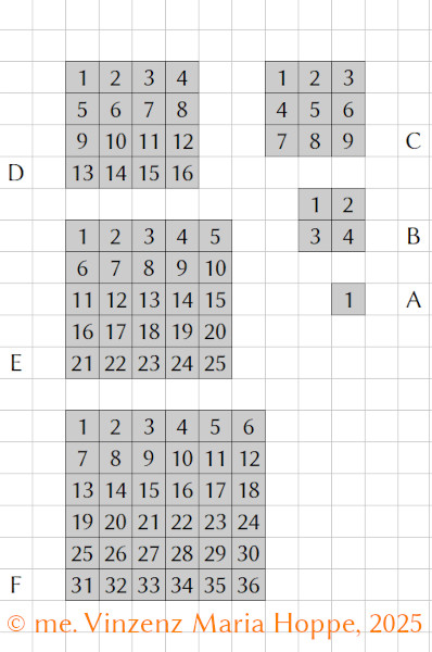 Bildrechte: © me. Vinzenz Maria Hoppe, 2025<br />Melencholia I (Abb. 3):<br /><br />Gleichmäßige Rasterfelder mit einbeschriebenen Zahlengrößen natürlicher Ordnung:<br />Gleichmäßige RAsterfelder natürlicher Ordnung mit in die Zellen der Rasterfelder (nach bestimmter Ordnung) einbeschriebenen natürlichen Zahlengrößen entwickeln sich nach spezifisch und relativ einfach zu ermittelnden mathematischen (bzw. mathematisch-geometrischen) Gesetzmäßigkeiten. Die Gesamtanzhal jeweiliger Zellenelemente in die z.B. deckungsgleich mit den Entwicklungsschemata Zahlengrößen einbeschrieben werden können, richtet sich dabei nach dem Entwicklungsschemata der Quadratzahlreihe (hier dargestellte Rasterfelder von Rasterfeldseitenlänge von einem bis hin zu 6 Elementen):<br /><br />Rasterfelder:<br />bei N = {1, 2, 3, ...,}<br /><br />1x1 = 1 Zellenelement (einbeschriebene natürliche Zahlengröße 1)<br />2x2 = 4 Zellenelemente (einbeschriebene natürliche Zahlengrößen 1 bis 4)<br />3x3 = 9 Zellenelemente (einbeschriebene natürliche Zahlengrößen 1 bis 9)<br />4x4 = 16 Zellenelemente (einbeschriebene natürliche Zahlengrößen 1 bis 16)<br />5x5 = 25 Zellenelemente (einbeschriebene natürliche Zahlengrößen 1 bis 25)<br />6x6 = 36 Zellenelemente (einbeschriebene natürliche Zahlengrößen 1 bis 36)