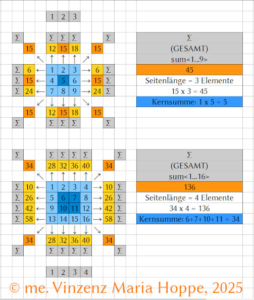 Bildrechte: © me. Vinzenz Maria Hoppe, 2025<br />Melencholia I (Abb. 6):<br /><br />Die Achssummenentwicklung in Albrecht Dürers (d.J.) in 'Melencholia I' (1514) dargestellten 'Magischem Quadrat':<br />dargestellt sind die Summen die sich in den Hauptachsen des Magischen Quadrats ergeben, d.H. in den 4 horizontalen und 4 vertikalen Achsen sowie in den beiden Diagonalachsen (Hauptdiagonale sowie Gegendiagonale). Die spezifischen Achssummen ergeben sich dabei jeweils aus 4 (vier) summierten Elementen (Zahlengrößen).
