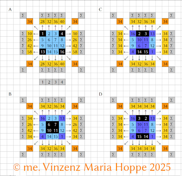 Bildrechte: © me. Vinzenz Maria Hoppe, 2025<br />Melencholia I (Abb. 1):<br />Rasterfeld von 4x4 Zellen mit unverwürfelten einbeschriebenen natürlichen Zahlengrößen von 1 bis 16 in natürlicher Ordnung (hier in Ordnungsrichtung von links nach rechts und von oben unten. Die Anordnung der Zahlengrößen ergibt sich damit mit:<br /><br />HORIZONTAL:<br />1te Reihe: 1, 2, 3, 4<br />2te Reihe: 5, 6, 7, 8<br />3te Reihe: 9, 10, 11, 12<br />4te Reihe: 13, 14, 15, 16