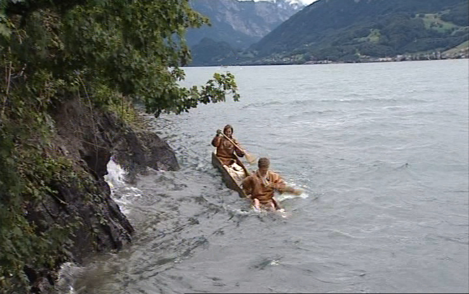 Scherz beiseite - Baujahr 2009, und mit Motorsäge und Stahlwerkzeug, allerdings haben wir auch einiges an Stein- und Geweihwerkzeug getestet. U a. waren Teilnehmer der Serie "Pfahlbauer von Pfyn" des Schweizer Fernsehens dabei, und denen hat er während der Wochen, die sie im Pfahlbau gelebt haben, als Wasserfahrzeug gedient. Die beiden Jungs auf dem Bild waren über die Berge Salz holen und sind auf dem Rückweg im Walensee auf Sehrohrtiefe gegangen, weil sie zu spät losgefahren sind. Dort gibts um die Mittagszeit tückische Fallwinde aus dem Säntis und kurze, steile Wellen - dafür war der Einbaum nicht konstruiert.